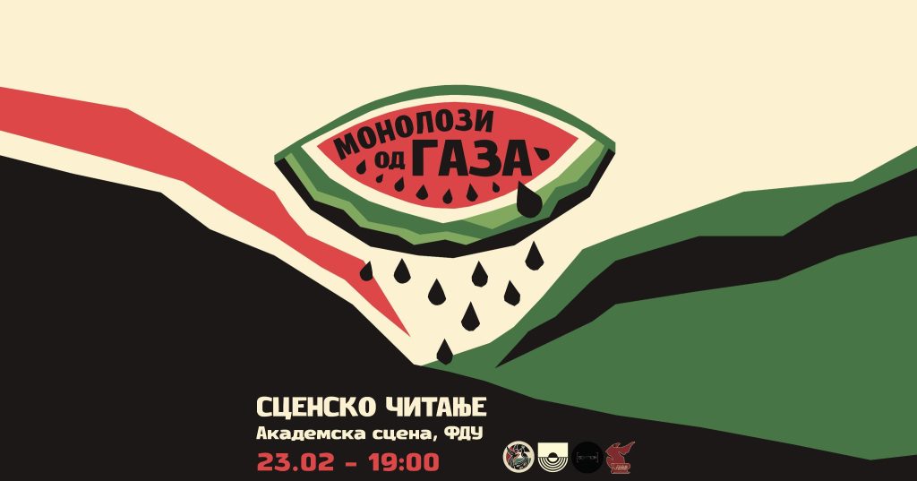 Активисти од Иницијативата „Сите за Палестина“ и актери од независната театарска група „Штрих“ организираат сценско читање на „Монолозите од Газа“ на Академската сцена на ФДУ .