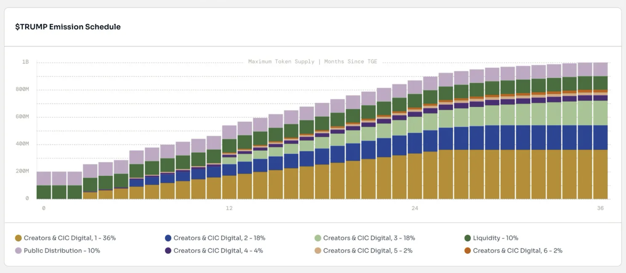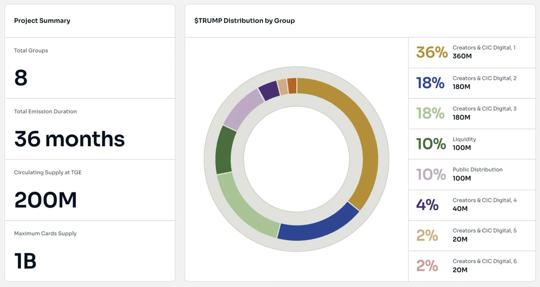 Моментално вкупната понуда на Трамп коин е лимитрана на 1 милијарда токени. Тоа значи дека засекогаш ќе има само 1 милијарда токени кои што ќе можат да се купат. Но, при креирање и лансирање на проектот, понудени се само 200 милиони токени. Останатите 800 милиони треба да бидат достапни за купување во текот на наредните неколку години. Главната причина зошто веднаш не се понудени сите 1 милијарда токени за купување е стабилноста, цената да не паѓа, иако тоа не функционира баш најдобро.