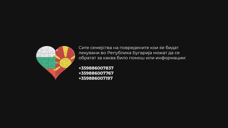 Во врска со трагичната несреќа која се случи на 16 март 2025 година во дискотека „Пулс“ во Кочани, сите семејства на повредените кои ќе бидат лекувани во Република Бугарија можат да се обратат за каква било помош или информации: