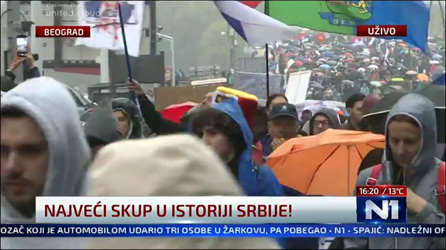 Колоните демонстранти, кои одговорија на повикот на студентите во блокада, пристигнуваат од сите делови на градот. Набљудувачите оценуваат дека станува збор за историски протест. Дождот малку стивна, а додека низ споредните улици луѓето се движат, на Булеварот кај Ташмајдан во близина на Собранието речиси нема простор за поместување. Рестораните и кафулињата работат со полн капацитет, а луѓето чекаат ред за тоалет или кафе за носење, јавуваат репортерите.