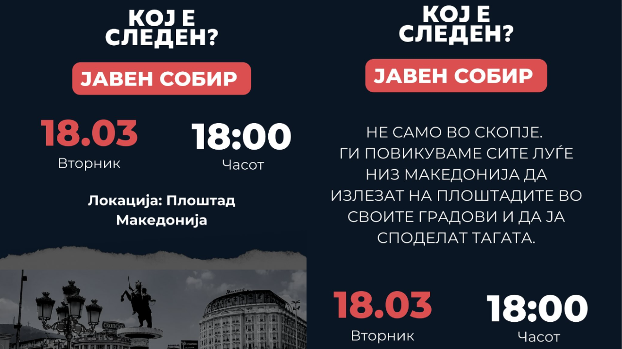 Движењето и иницијативата „Кој е следен?“ ги повикува сите граѓани на јавен собир кој ќе се одржи утре на 18ти март на плоштадот Македонија во Скопје со почеток од 18 часот.
