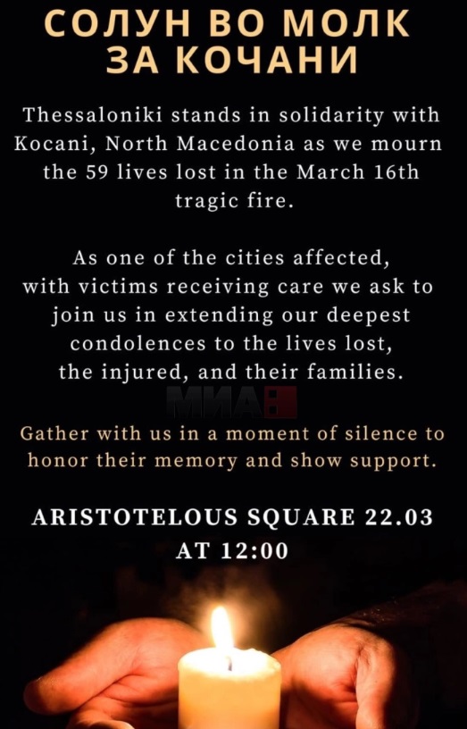 Дополнително, во спомен на загинатите ќе има и црни балони, а преку социјалните мрежи објавија повик „Солун се солидаризира со Кочани“.