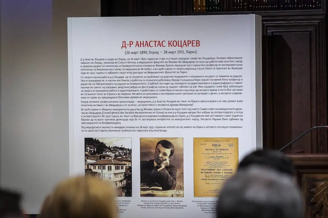 „Знам дека неговата научна преокупација била дијагнозата и третманот на ракот со помош на радиумот, што јас го обвинувам за неговата прерана смрт. Знам дека е првиот научник кој изработил рендгенографија на фотографска плоча на пациент заболен од рак. Но, не ми е многу јасно што значи тоа. Но едно е јасно. За нас Македонците, д-р Коцарев е познат како вистински, инспиративен zoon politikon, храбар, луциден македонски политички активист во Швајцарија и во Франција. Тој е иницијаторот, предводникот на обединувањето на македонските друштва во Цирих и во Лозана, во Заедничкото друштво на Македонците за независна Македонија, чијшто претседател станал. Веќе беше спомената Версајската конференција – да, тој е човекот којшто поднел барање за тричлена комисија којашто би ги застапувала интересите на македонскиот народ, но и тој кој поднесувал бројни петиции за праведно решавање на македонското прашање“, нагласи претседателката.