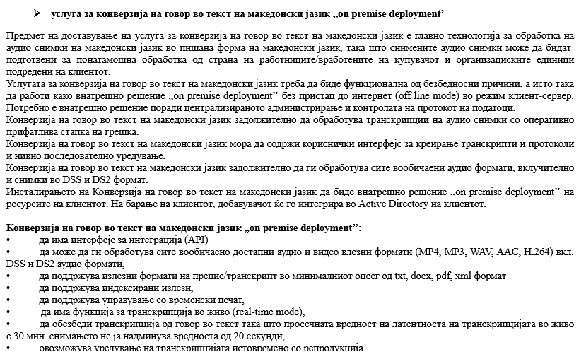 Во истиот тендер, Владата бара и услуга за конверзија на говор во текст на македонски јазик и истата да може да се користи без пристап на интернет, односно off-line.