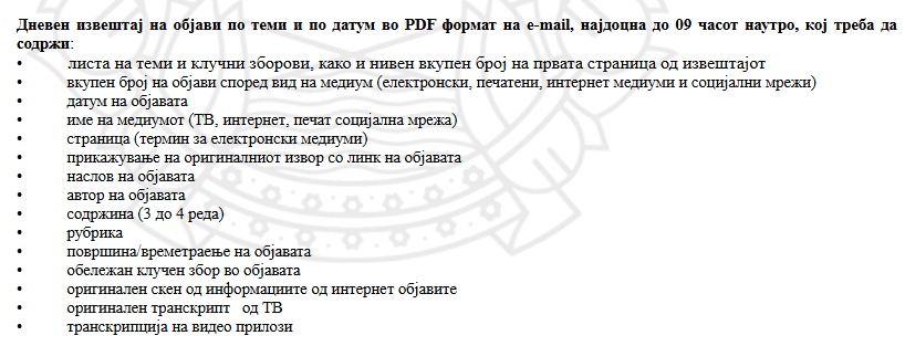 Исто така, бара да има дневен извештај за тековниот ден најдоцна до 9 часот наутро следниот ден каде ќе бидат собрани сите податоци, кои теми се обработувани, од кои медиуми, кога е објавено, линк до објавата, наслов, автор, кратка содржина, транскрипција на видео прилози итн. Ќе се мониторираат медиумите и објавите на социјалните мрежи и на македонски и на албански јазик.