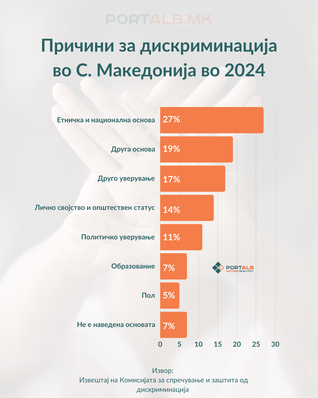 Најчеста основа за дискриминација во 2024 е националната или етничката припадност која е посочена во 109 претставки што е 27 отсто од вкупниот број на претставки – се наведува во извештајот.