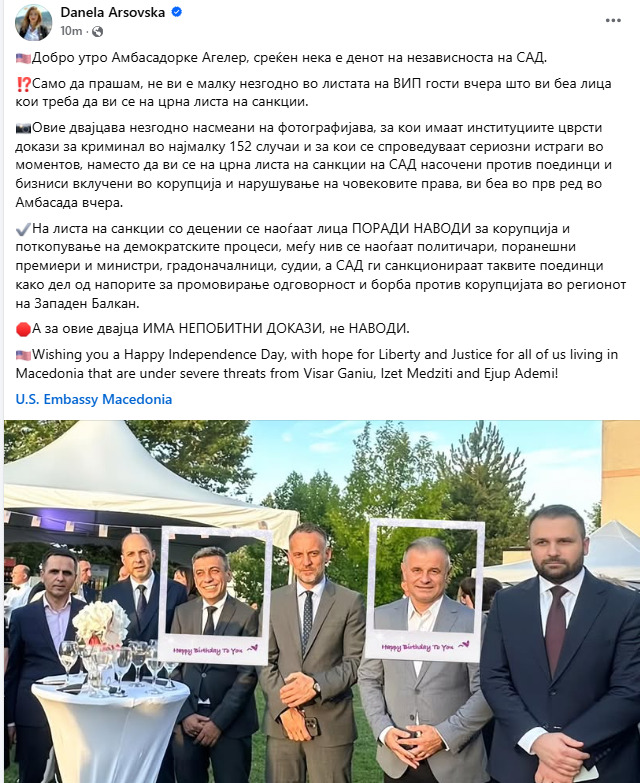 Арсовска до амбасадорката Агелер: „Не ви е малку незгодно во листата на ВИП гости што ви беа лица кои треба да ви се на црна листа на санкции“