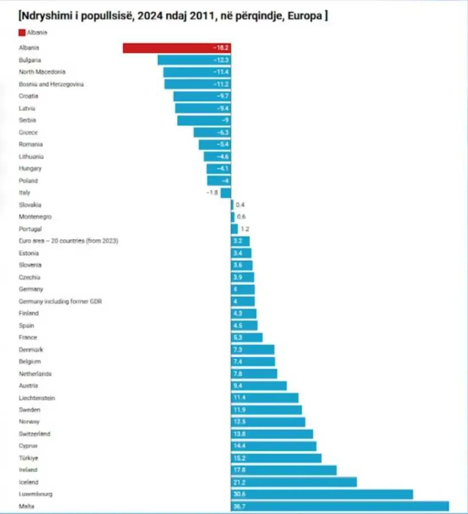 Според извештајот објавен од euronews.al, населението на Албанија е намалено за 18 проценти на крајот на 2024 година во однос на 2011 година, што значи загуба од над 500.000 жители. Овој пад е највисок во Европа.