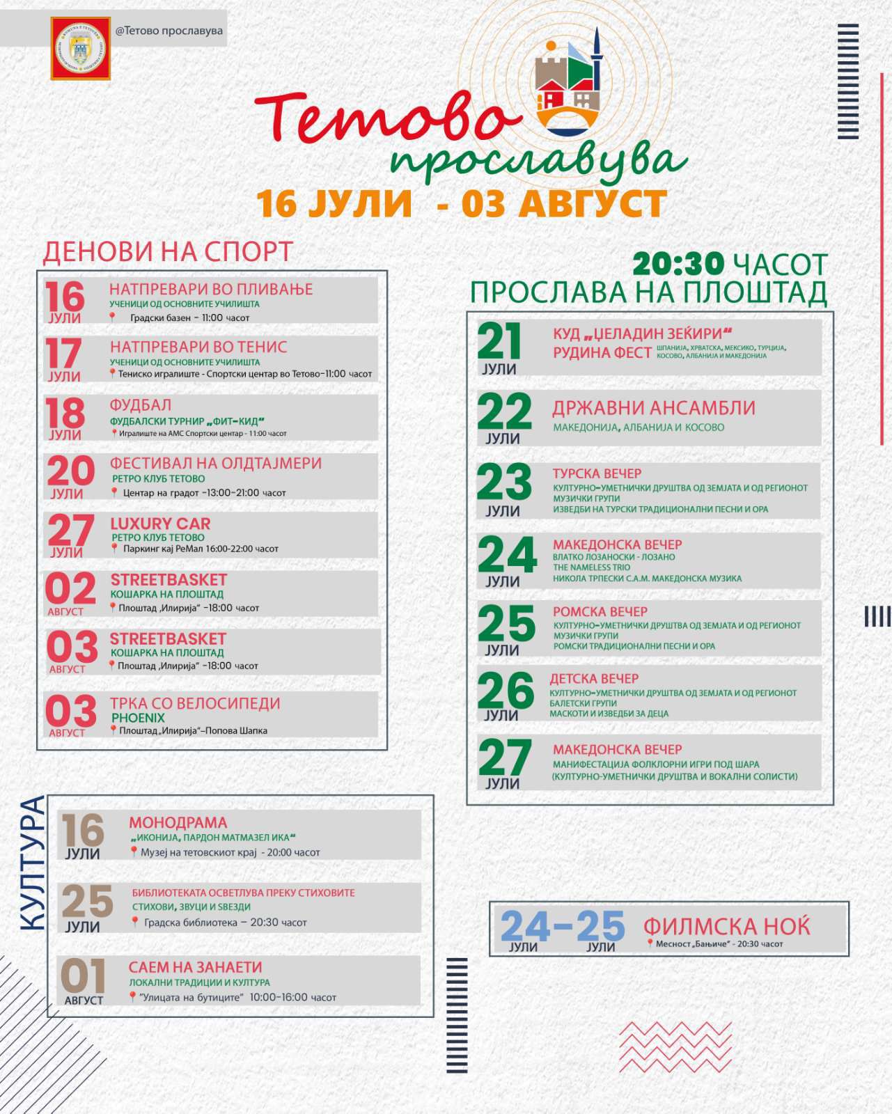 Имено, во агендата на годинешното „Тетовско културно лето“ која патем беше напишана и објавена само на албански јазик, се предвидени денови на култура врз база на народите кои живеат во Тетово, па така на организаторот „му текнало“ да си поигра со чувствата на македонскиот народ и предвидел два дена на „македонската заедница“. Да беше ова објава за „Поградечко или Призренско лето“ ќе беше се во ред, ама во Тетово, град во Република С. Македонија сопствениот домицилен народ да е „заедница“ е непрофатливо до срж.