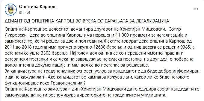 Општина Карпош ги демантира тврдењата на кандидатот за градоначалник, Сотир Лукровски, поддржан од ВМРО-ДПМНЕ, дека во општината има 11.000 нерешени предмети за легализација.