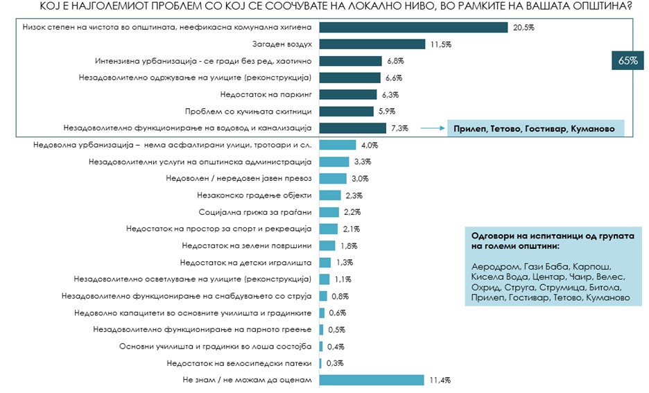 Дури 65 отсто од испитаниците на листата на најголеми проблеми со кои се соочуваат во нивните општини се хигиената, загадениот воздух, интензивната урбанизација, улиците, немањето паркинг, проблемот со кучињата скитници и нефункционирањето на водоводот и канализацијата.