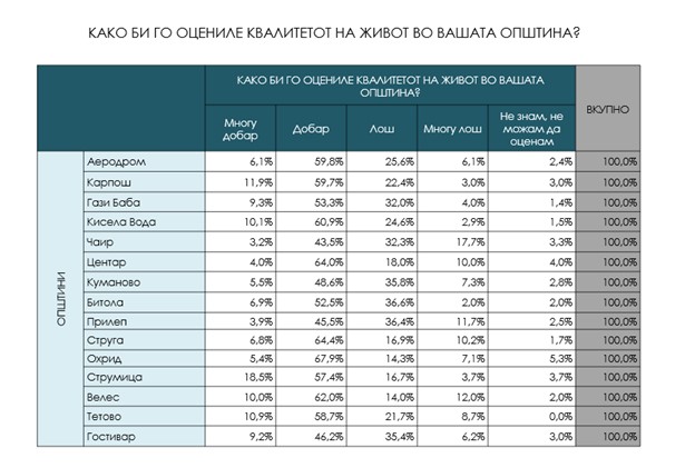 Според одговорот на прашањето за оценката на квалитетот на животот во општината каде што живеат најзадоволни се жителите на општините Тетово, Струмица, Велес, Охрид, Кисела Вода, Карпош, Центар, Куманово… Незадоволни од квалитетот на животот се жителите на Чаир, Гази Баба, Прилеп…