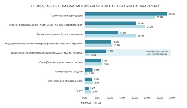 За најголемиот број на испитаници и натаму еден од најважните проблеми со кои власта мора да се соочи е криминалот и корупцијата, ниските плати, растот на цените… Забележливо е дека проблемот со загадениот воздух во однос на претходното истражување (јуни 2025) е значајно истакнат – од 1,9% на 8,7%.