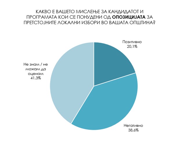 Од понудените програми на кандидатите од опозицијата за претстојните локални избори незадоволни се 38,6 отсто од испитаниците, а позитивен одговор дале 20,1 отсто.