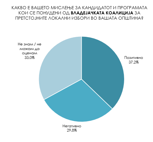 Oд досега понудените програми на кандидатите за градоначалници за претстојните Локални избори, најголемиот број од испитаниците одговориле дека понудата на припадниците на владејачката коалиција е позитивна (37,2%), а негативен одговор дадоа 29,8 отсто од испитаниците.