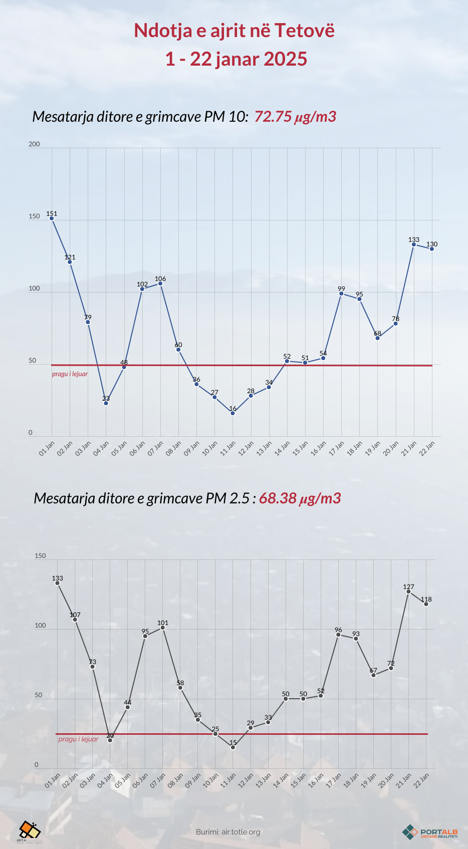 Загадувањето на воздухот во Тетово 1-22 јануари, 2025 година Дневна просечна вредност на ПМ 10 честичките 72,75 μg/m3 Дневна просечна вредност на ПМ 2.5 честичките 68,38 μg/m3 Извор: air.totle.org Инфографик: Фисник Џелили/Порталб.мк