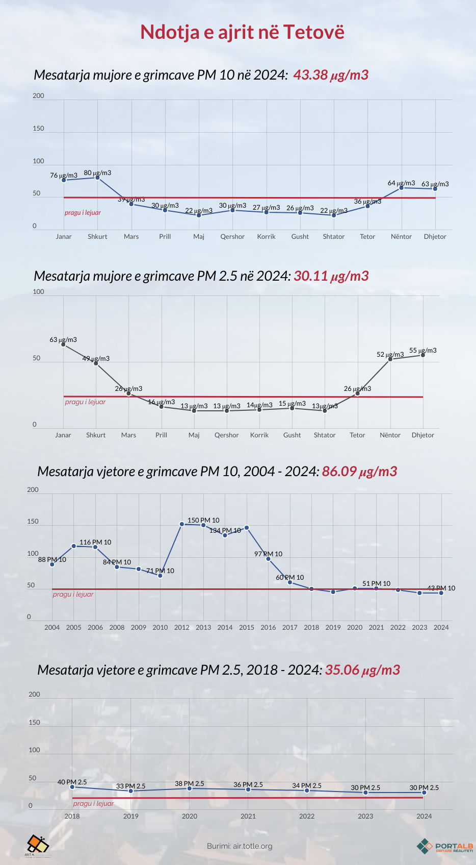 Загадувањето на воздухот во Тетово Месечна просечна вредност на ПМ 10 честичките во 2024 година 43,38 μg/m3 Месечна просечна вредност на ПМ 2.5 честичките во 2024 година 30,11 μg/m3 Месечна просечна вредност на ПМ 10 честичките, 2004-2024 година: 86,09 μg/m3 Месечна просечна вредност на ПМ 2.5 честичките 2018-2024 година: 35,06 μg/m3 Извор: air.totle.org Инфографик: Фисник Џелили/Порталб.мк