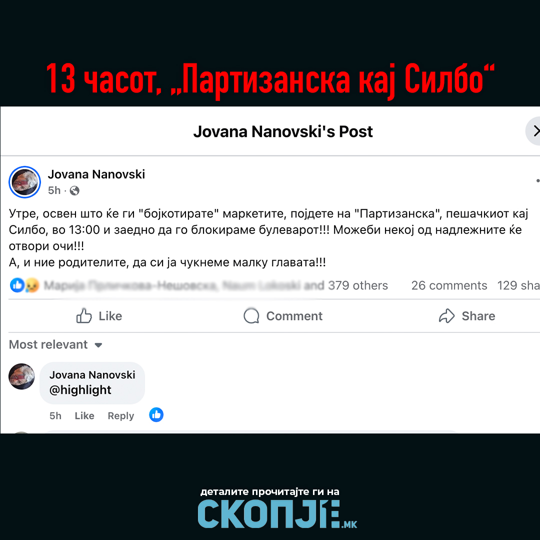 „Утре, освен што ќе ги “бојкотирате” маркетите, појдете на “Партизанска”, пешачкиот кај Силбо, во 13:00 и заедно да го блокираме булеварот!!! Можеби некој од надлежните ќе отвори очи!!! А, и ние родителите, да си ја чукнеме малку главата!!!“, стои во најавата.